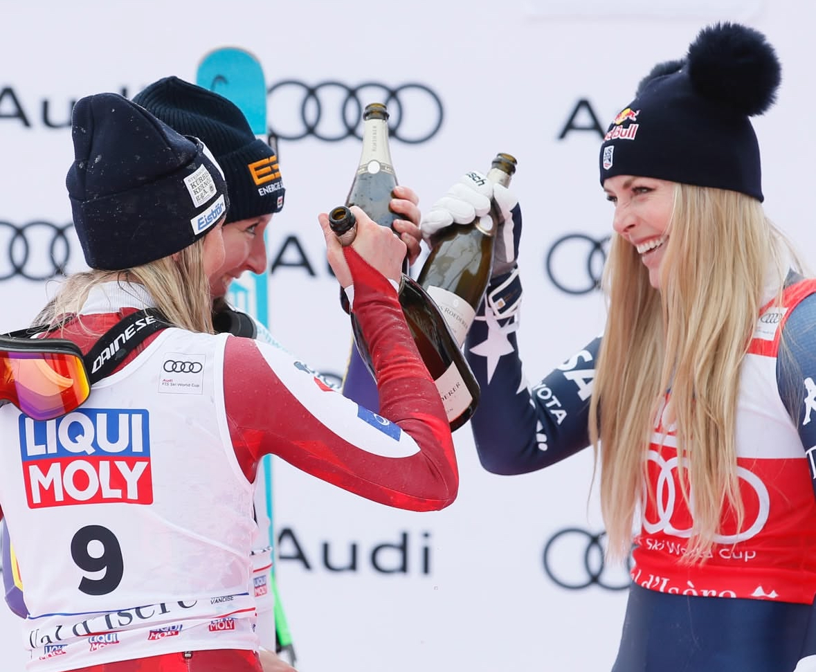Lindsey Vonn, starting in bib 8, looked poised to take over the lead. She was fast through multiple splits but could not carry the momentum into the finish and crossed the line 0.09 seconds behind Weidle-Winkelmann after a line error in the lower mid-section. “I didn’t quite see the terrain, and I lost my balance,” Vonn said in a post-race interview with FIS. “It cost me probably half a second or more… but I’m just happy that I hung on to the podium and the red bib.”