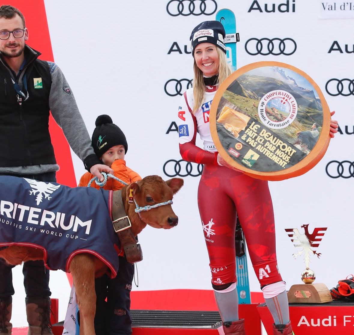 Conny Hütter with her prizes: a calf and a wheel of cheese. | Image: FIS Alpine IG