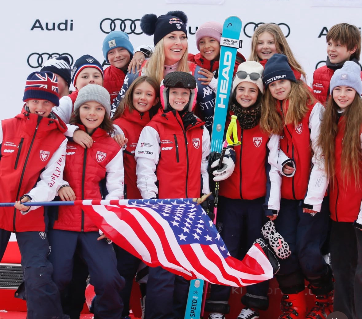 Lindsey Vonn shared the podium with kids from the local ski club. | Image: FIS Alpine IG