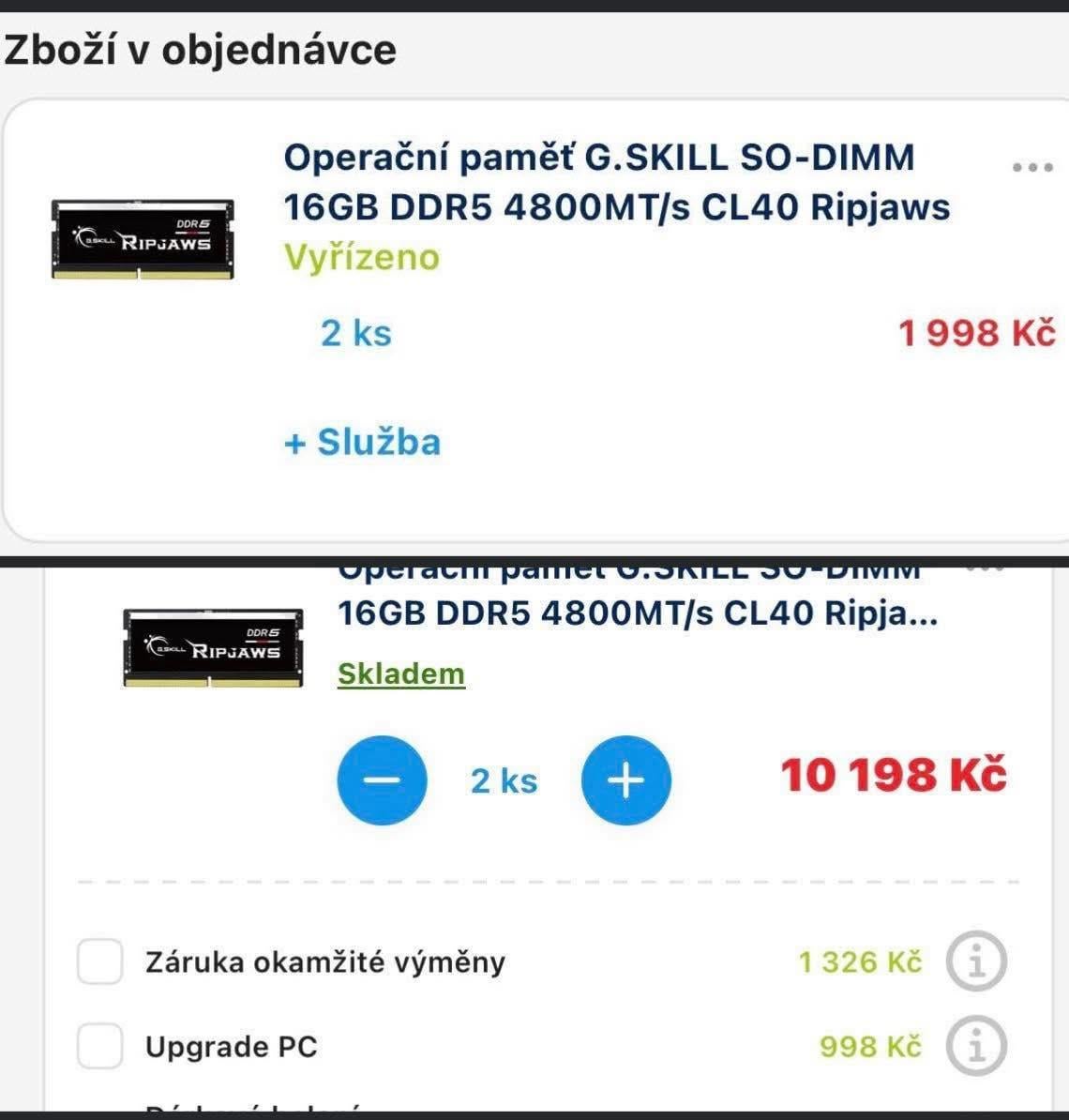 Ted jen se modlit aby se ta ramka nerozbila, protoze prodejci pry ani nezkouseji projit reklamacnim procesem a ramku odeslat vyrobci, a rovnou vraceji penize protoze na to legalne maji pravo. Jenze za 4500 Kc si dneska nekoupim ani 16GB, protoze 16GB kity v podstate neexistuji, vsichni je vykoupili, a 32GB zacina na 9 tisicich. Takze bych musel zaplatit dvojnasobek za polovicni kapacitu. A nebo za 4 tisice koupit 2x8GB ramky do notebooku, a k tomu adapter ze so-dimm na klasicky dimm slot, coz by ale znamenalo celkem podstatne snizeni vykonu.