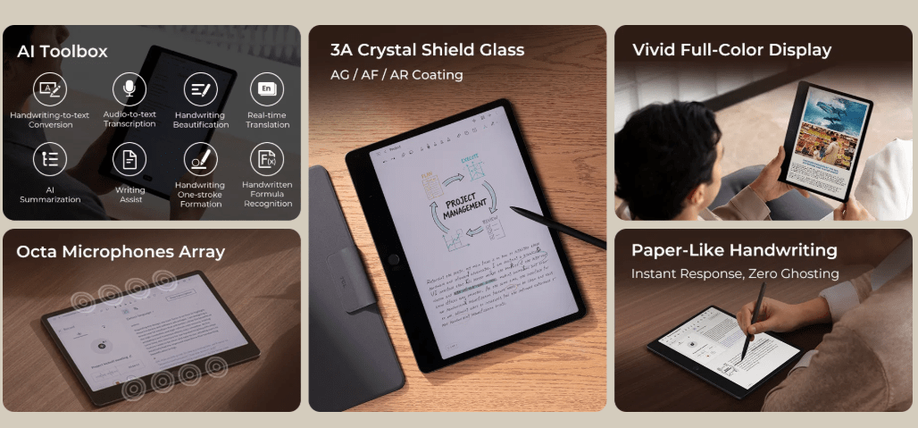 The Note A1 focuses heavily on stylus input. The tablet includes a stylus with dual tips and an integrated eraser, allowing for fast writing, sketching, and drawing. Handwritten notes can be turned into digital text, and the device includes AI-powered tools for note summarization, voice transcription, and smart content search. These features are designed to support productivity tasks such as meetings, lectures, and creative work.