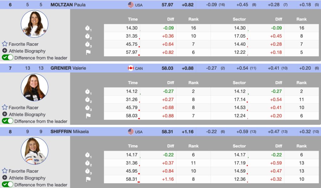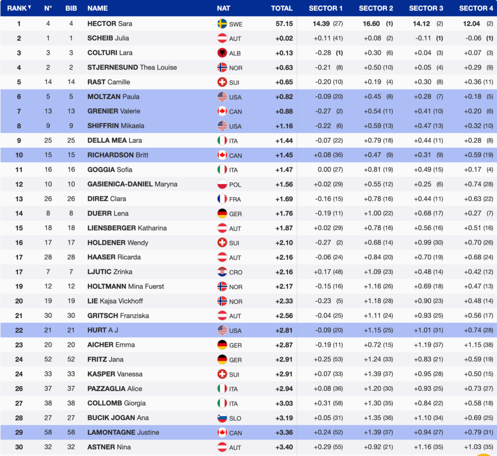 Paula Moltzan leads the pack of North Americans after a solid first run. She made a few small mistakes that she will look to clean up for the second run. Sitting sixth, 0.82 seconds behind Sara Hector, Moltzan will be aiming for one of her signature second-run pushes with podium ambitions in sight.