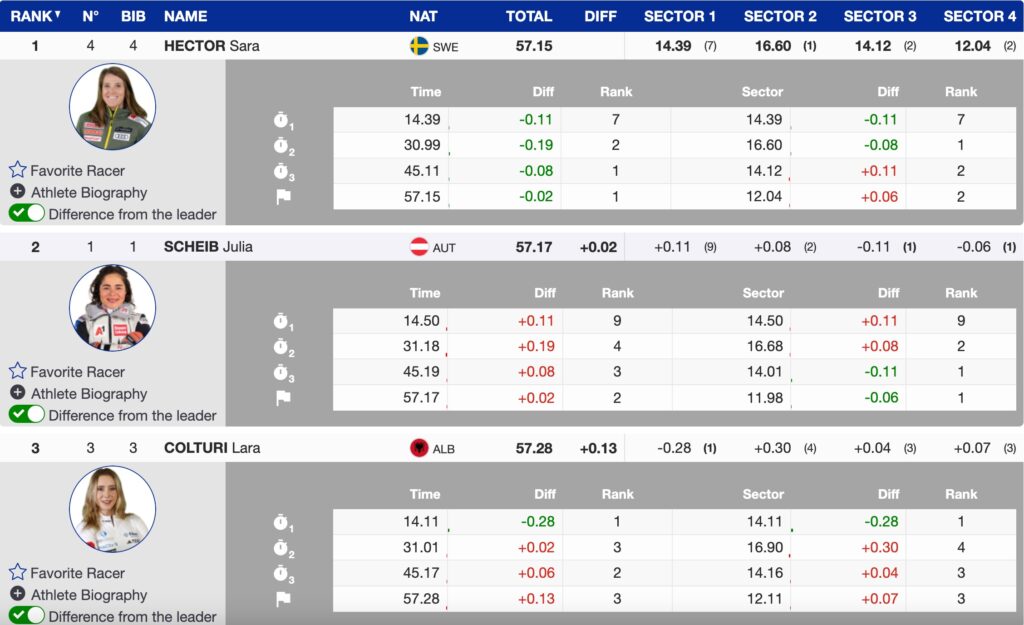 Lara Colturi (ALB) also delivered a strong performance. Attacking aggressively out of the start, she skied with precision from top to bottom. While not quite as clean as Hector and Scheib through the lower section, Colturi limited the damage and remains very much in the hunt. Sitting just 0.13 seconds behind Hector, she has a clear opportunity to tidy up those details in the second run and challenge for the top spot.