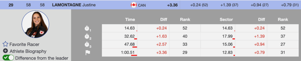 • Bib 58- Justine Lamontagne (CAN)– 29th, +3.36