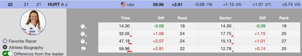 AJ Hurt made her return to the World Cup circuit following a hip injury. She sits 22nd after the first run and will aim to take advantage of a cleaner course in the second run to gradually regain her World Cup giant slalom speed. It was great to see her back in action.