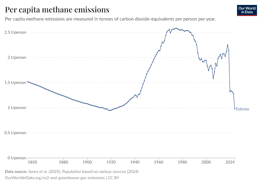 This first interactive chart here shows per capita emissions of methane each year. This is measured in ‘carbon dioxide equivalents’.
