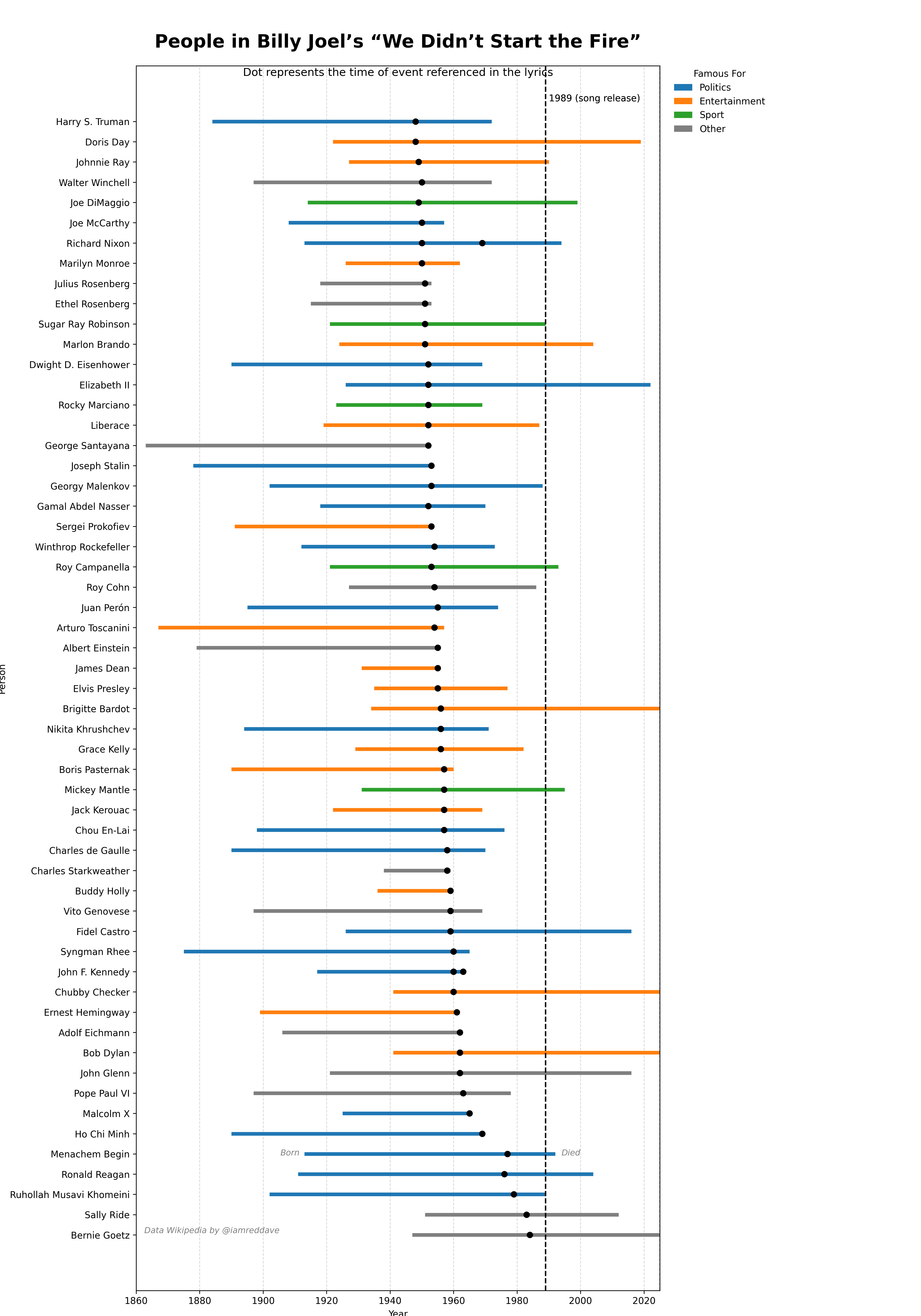 Data from https://en.wikipedia.org/wiki/List_of_references_in_We_Didn%27t_Start_the_Fire and https://everyday-learning.org/we-didnt-start-the-fire-historical-references/
