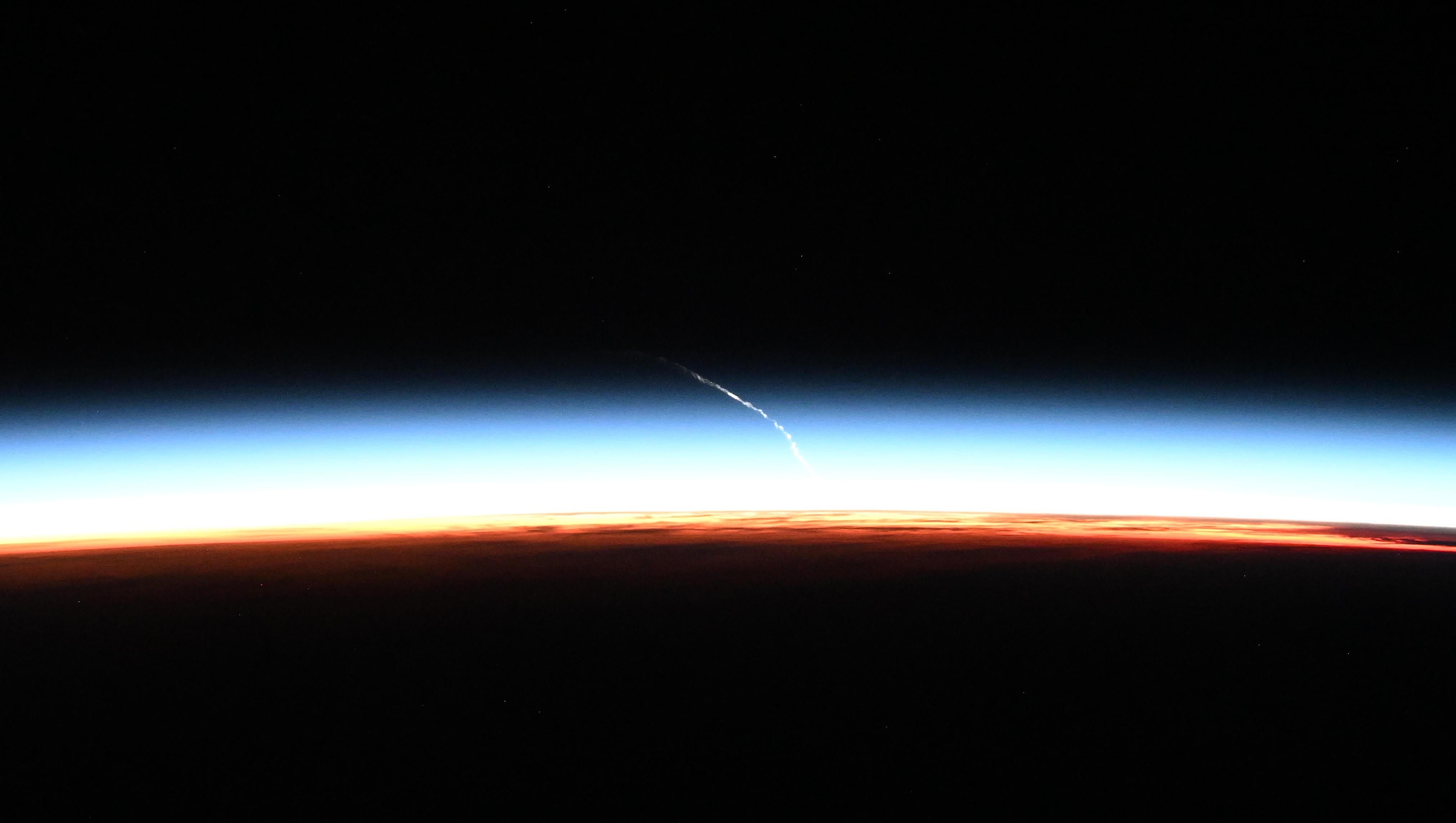 SpaceX Falcon 9 launch, seen from the ISS across Earth’s twilight horizon. I took this with Nikon Z9 on Expedition 72 to the ISS. We were overhead the south Atlantic ocean looking toward Florida, early April. I think this was a Starlink batch from Cape Canaveral!
