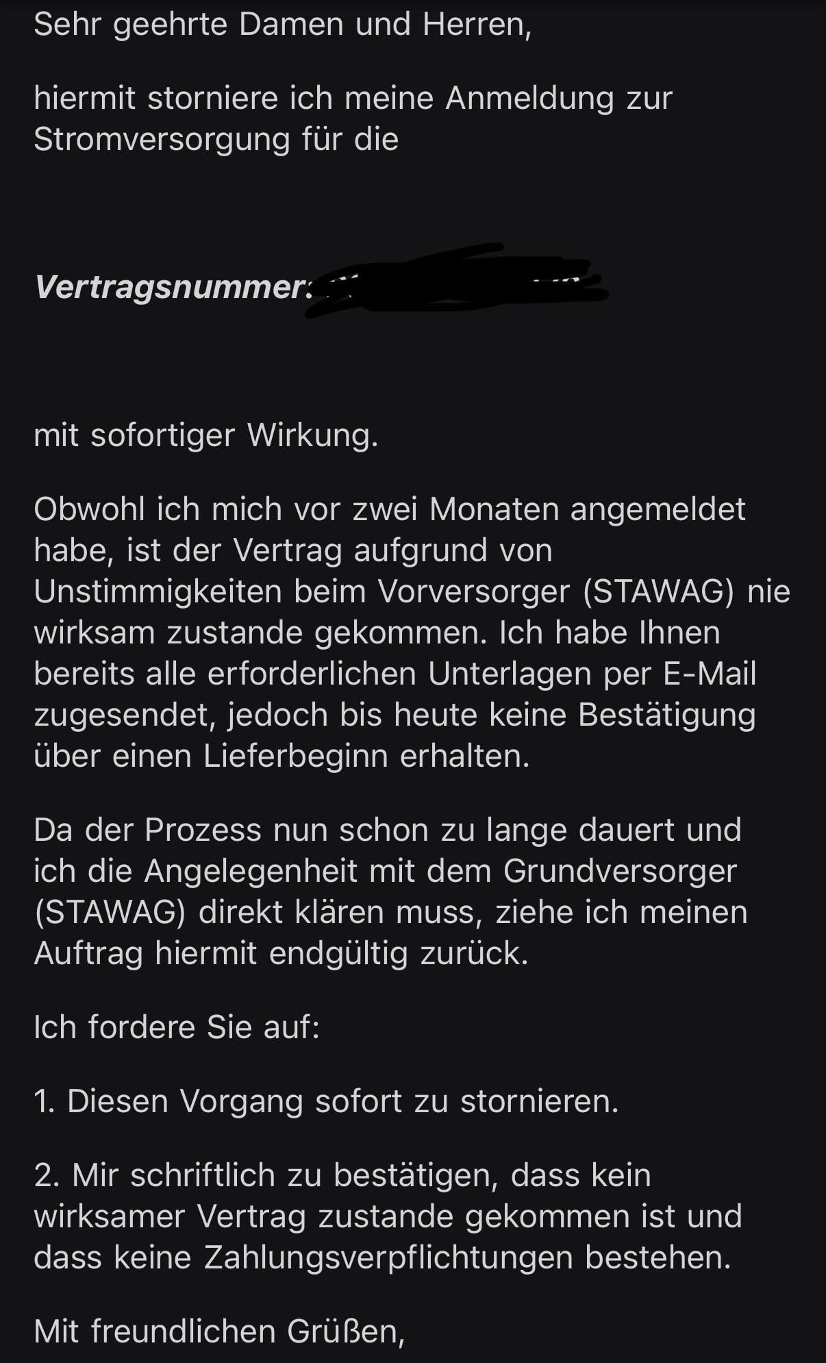 However, at this point everything feels very complicated, and I would like to resolve the issue of the electricity contract being under the wrong name with STAWAG first. Therefore, I sent an email to E.ON requesting the cancellation of my application.