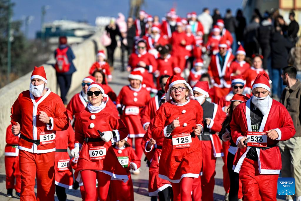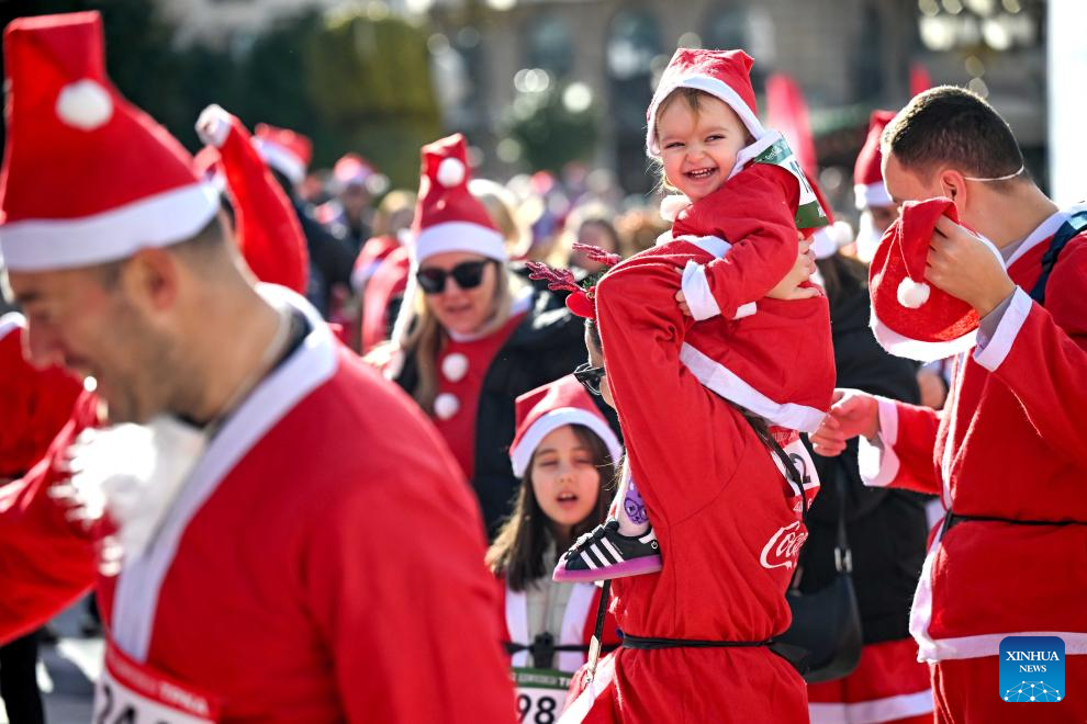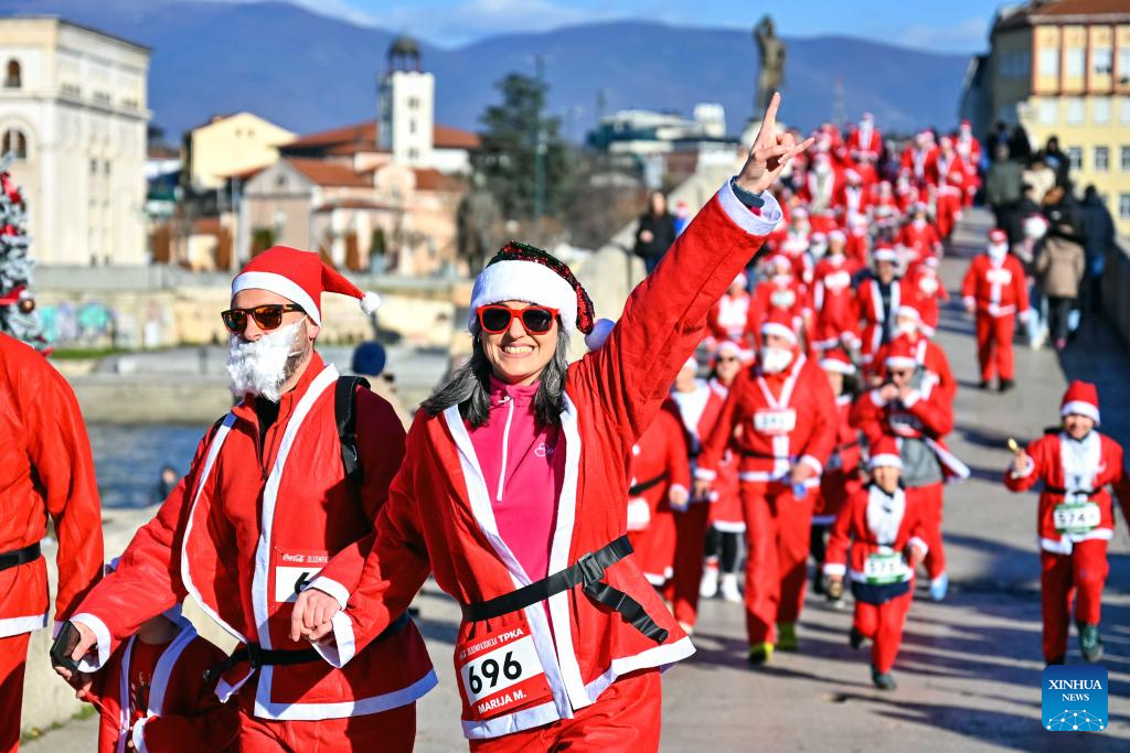 People dressed as Santa Claus participate in the traditional Santa race in Skopje, North Macedonia, Dec. 28, 2025. (Photo by Tomislav Georgiev/Xinhua)
