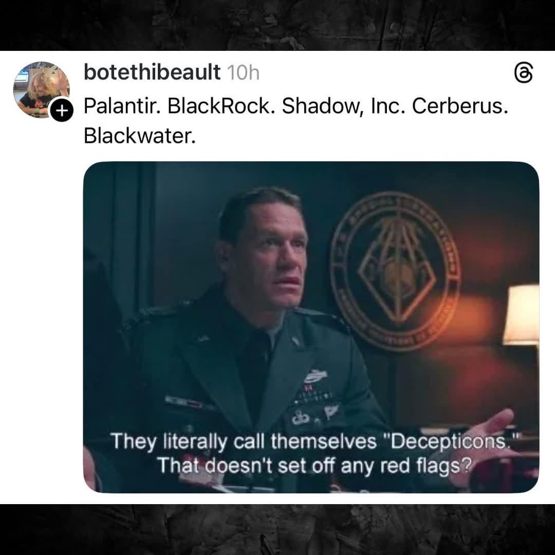 this the most on nose villain naming. shadow inc runnin elections, blackwater mercenaries damn