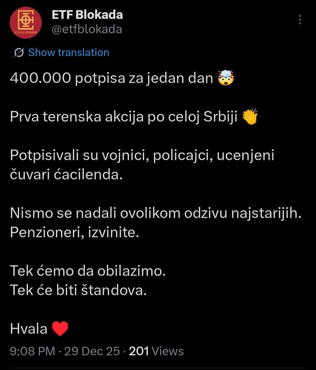 ako je bilo 400k onih koji su potpisali onda sam siguran da bar 2 miliona glasova ide za tu listu. Znam lično bar 15 ljudi koji bi glasali za studente a koje je mrzelo da se cimaju juče da potpisuju listu