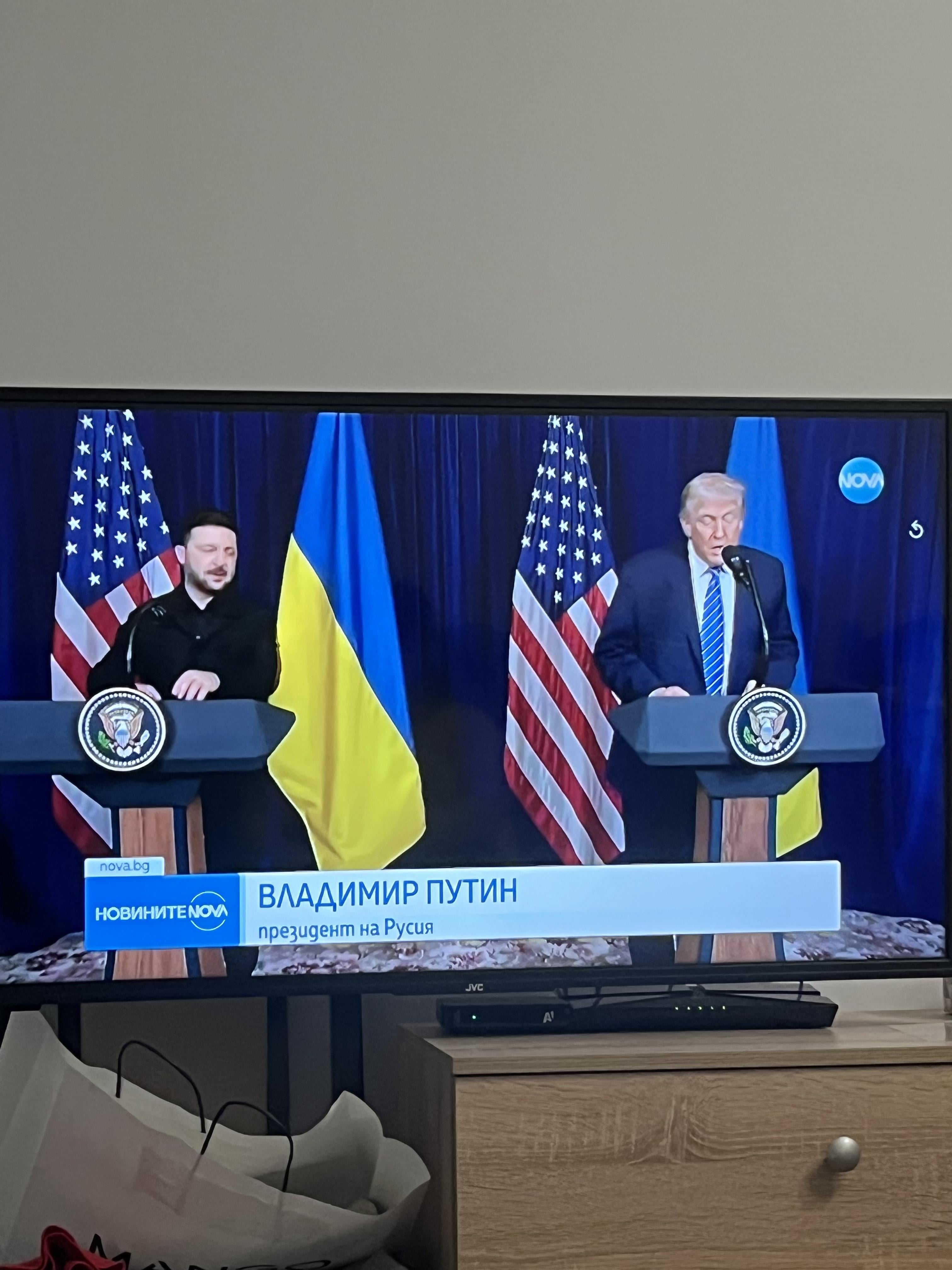 1. Според мен Путин е на екрана, само че е зад знамената.