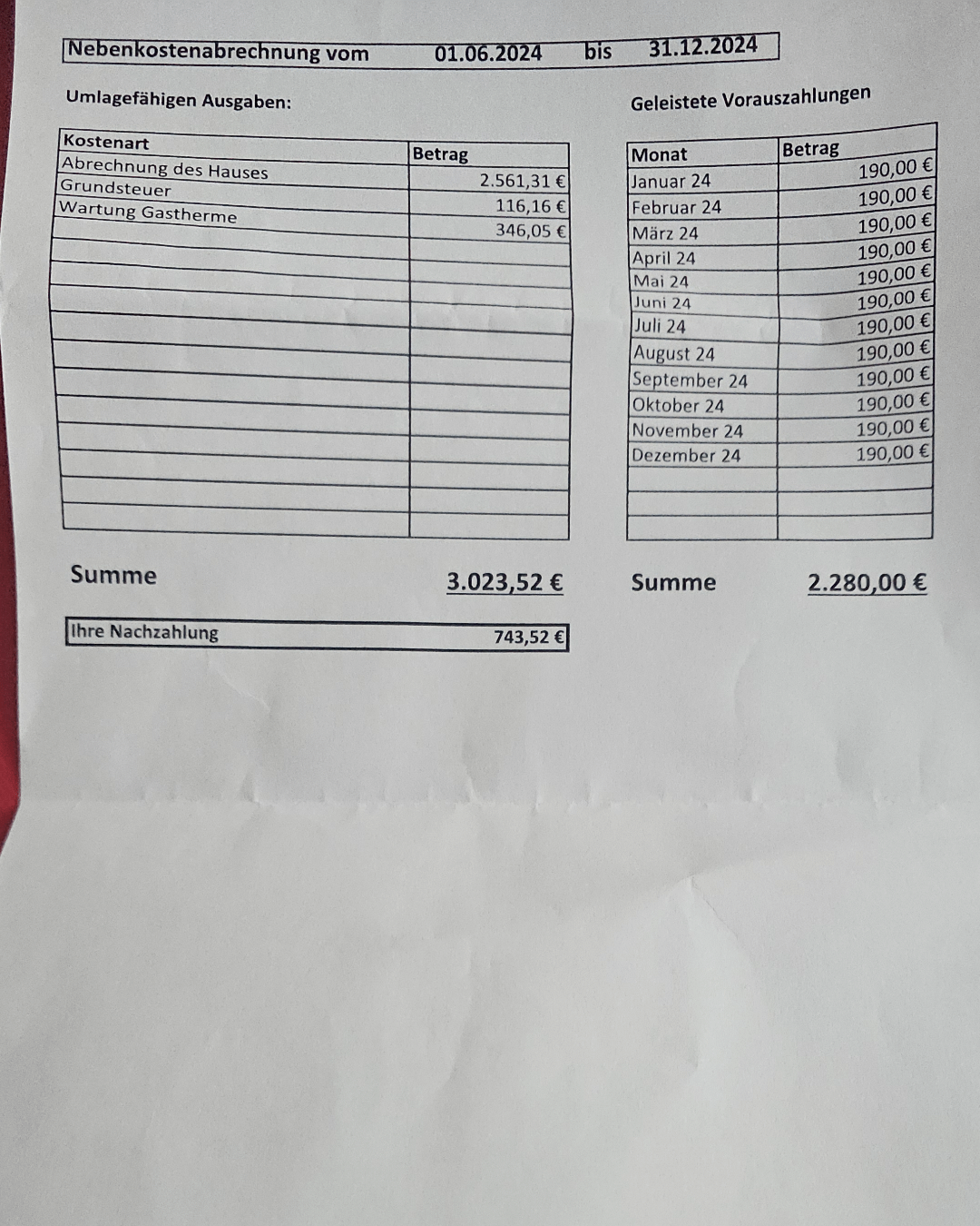 It is the amount written next to “Nachzahlung”: 743,52 EUR. It is the difference between the amount due (3023,52 EUR) and the sum of all prepayments made (2280 EUR).