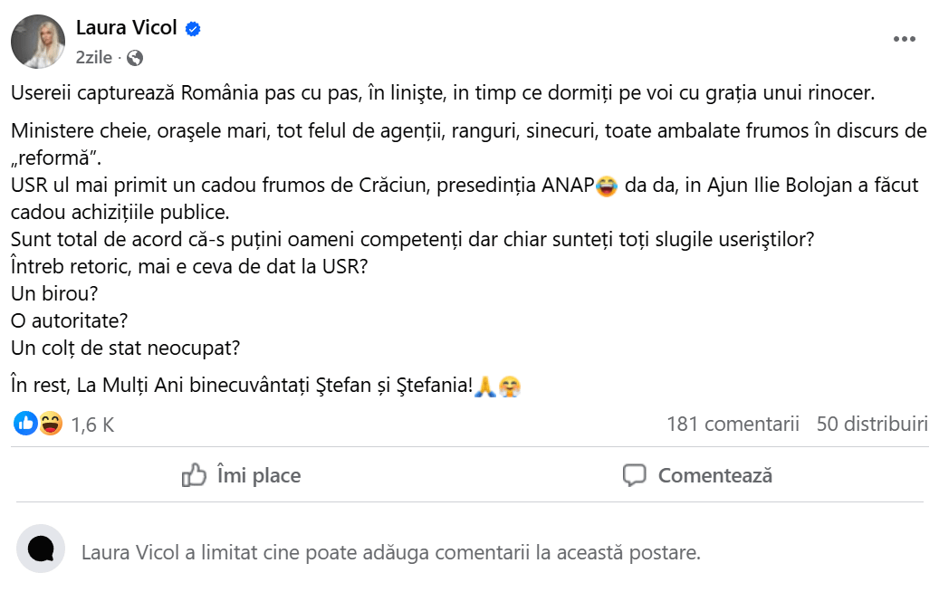 181 de comment-uri (ce-i drept a pus limita pt cine poate comenta) si 50 de share-uri in 2 zile, din care un share si vreo 2, 3 comment-uri sunt probabil de la panarama de fii-su. Nici macar prostimea nu prea mai pune botu’ la ce macane fufa asta.