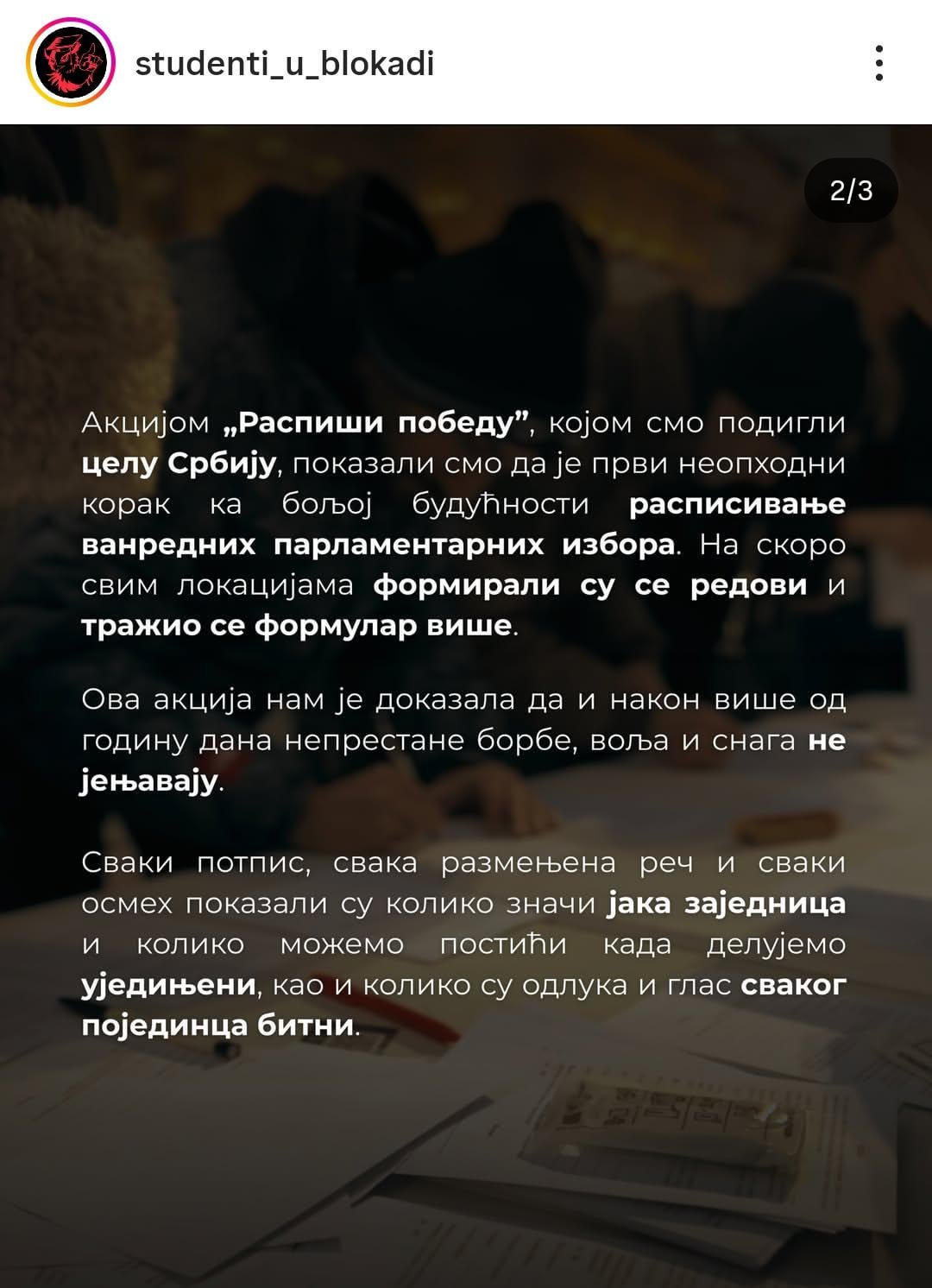 To je ogromna brojka. Od vecine ljudi koje znam niko juce nije potpisao podrsku a glasace za studente na izborima. Ako se svaki peti ili sesti opozicioni glasac potpisao dobro je.