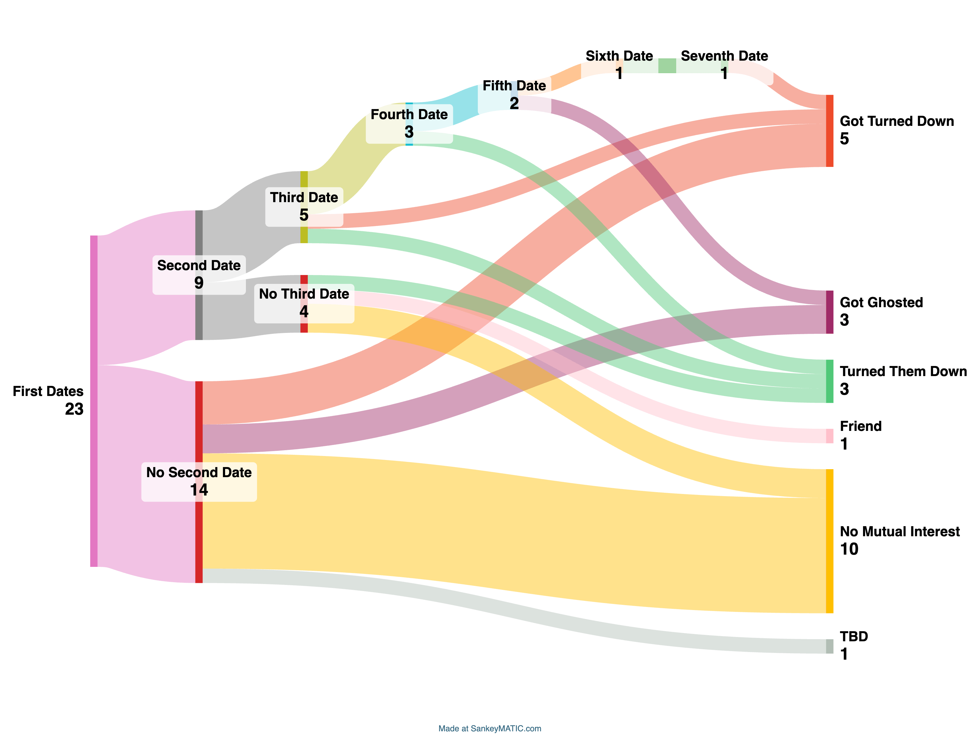The no second and third date categories are unnecessary. Getting ghosted after a fifth date has to hurt.