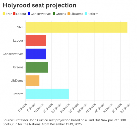 According to a seat projection from polling expert Professor John Curtice, if those results played out in the May elections, the SNP would return 59 MSPs, six short of the 65 needed for a majority.