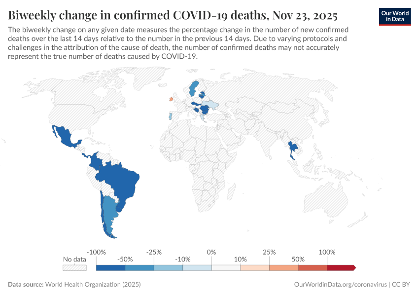 And the second map shows the percentage change (growth rate) over this period: blue are all those countries in which the death count in the last two weeks was lower than in the two weeks before. In red countries the death count has increased.