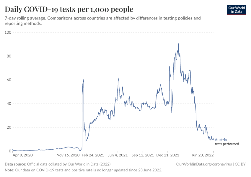 The number of tests does not refer to the same thing in each country – one difference is that some countries report the number of people tested, while others report the number of tests (which can be higher if the same person is tested more than once). And other countries report their testing data in a way that leaves it unclear what the test count refers to exactly.