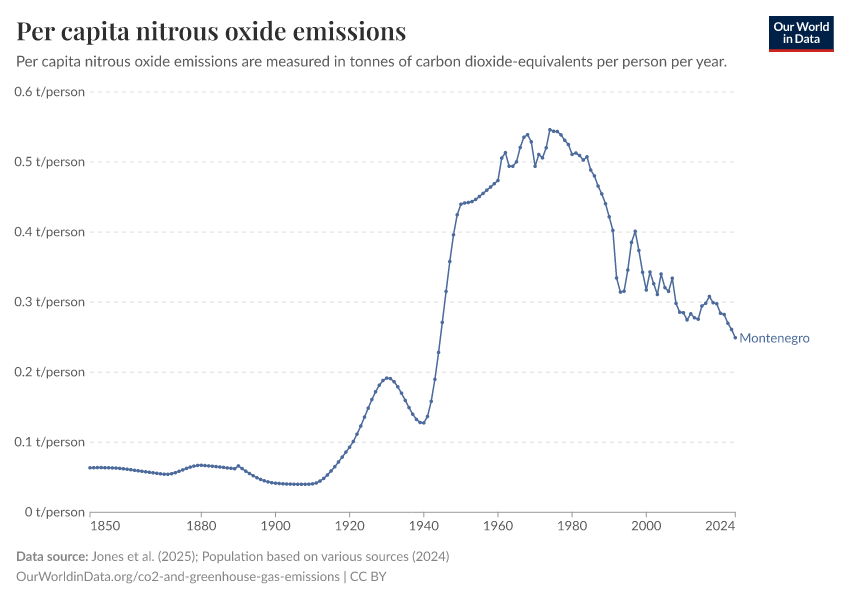 This first interactive chart here shows per capita emissions of nitrous oxide each year. This is measured in ‘carbon dioxide equivalents’.
