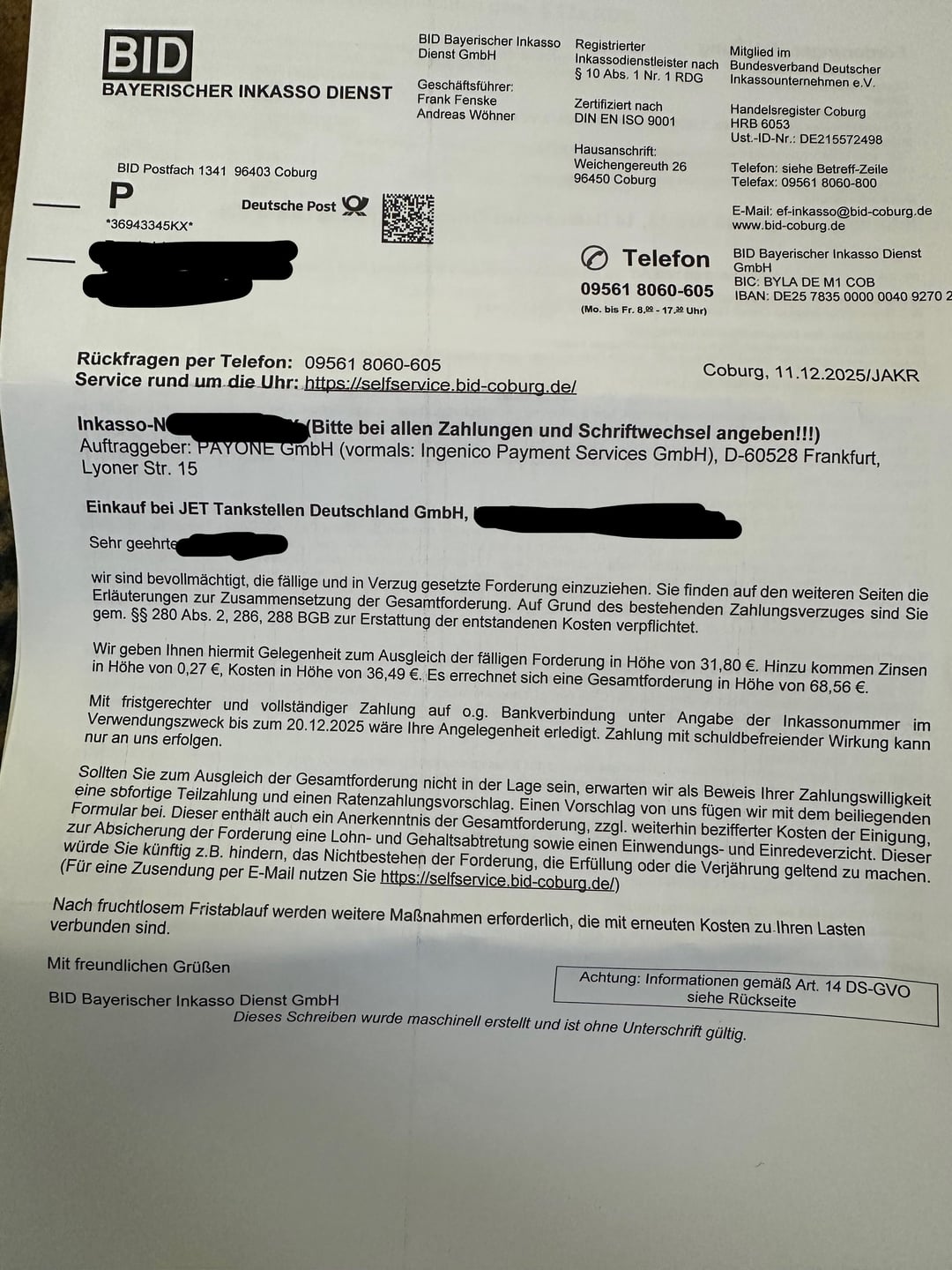 I have been receiving this letter from this Inkasso (debt collection) office for several months now. They claim that I have something unpaid at a JET gas station?!