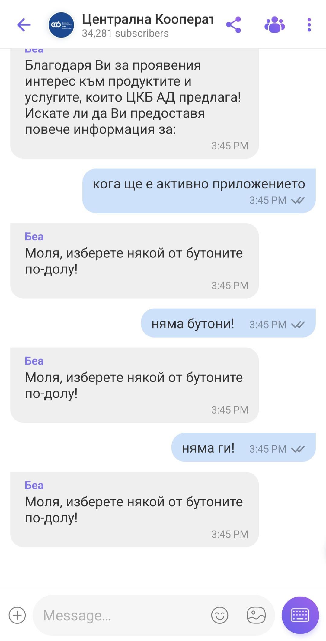 Аз затова им теглих една майна на tbi. Не си спомням как стана една грешка, но пиша им имейл – казват не оказвали помощ по имейл, да съм пробвал в приложението. Почвам чат, на излиза бот. Не си спомням какво питах, но стана подобна ситуация. Питам нещо, той говори глупости.