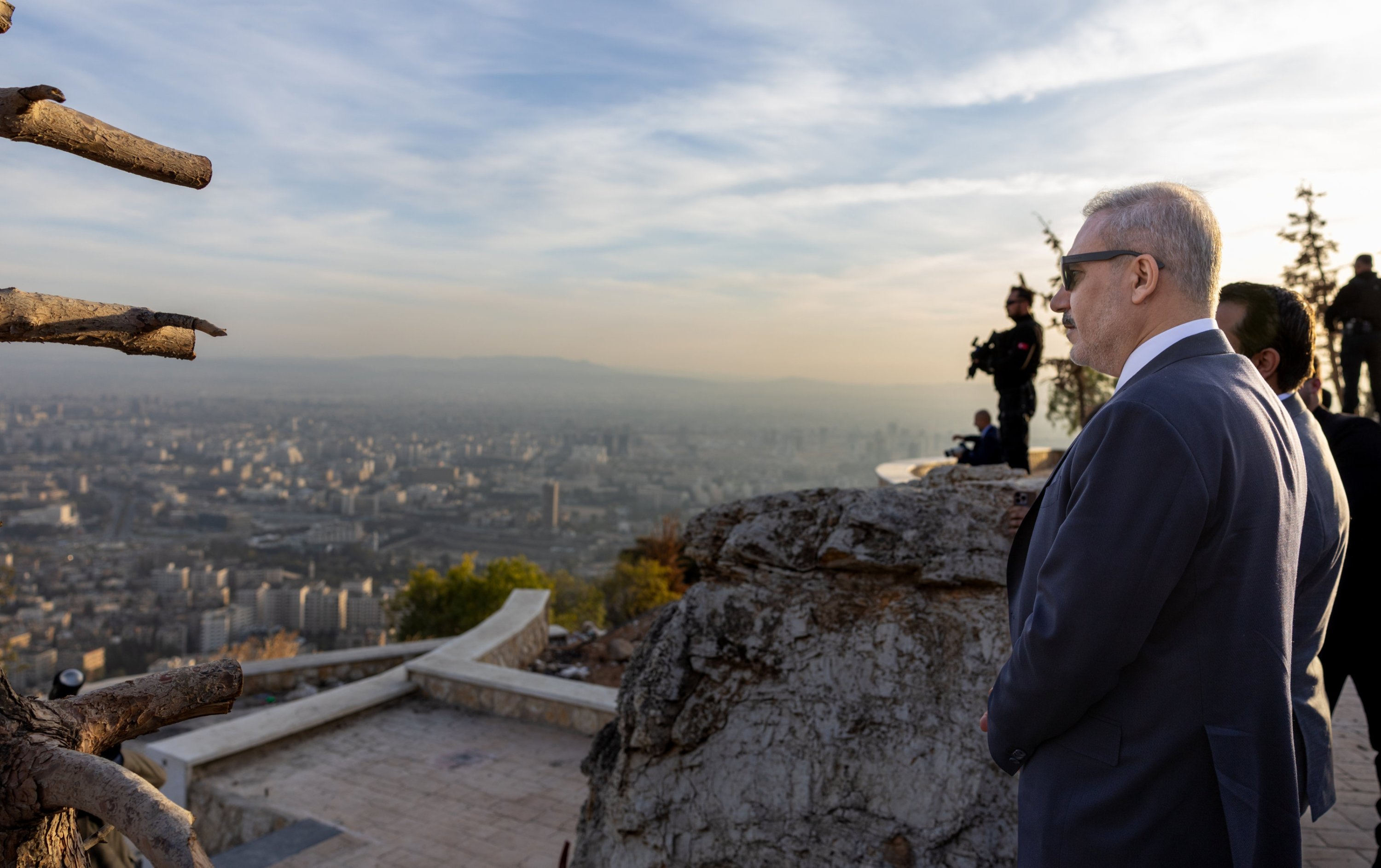Foreign Minister Hakan Fidan and Syrian counterpart Assad Hasan Shaybani watch Damascus from Mount Qasioun, Damascus, Syria, Dec. 22, 2025. (AA Photo)