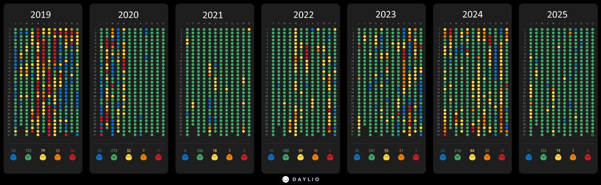 LadyTallPants on January 1, 2026 3:15 am I guess I need to add the following information: * Where or how you got the data **(Source)** – My wife tracking her day EVERY DAY for 7 years. Impressive. * The tool used to generate the visual **(Tool)** – Daylio app