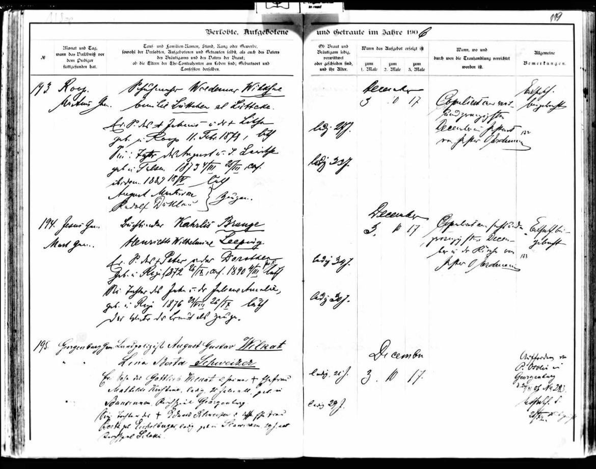 Hi I’m doing some genealogy research and came across my great-grandparents’ marriage record from St. Martins Church in Latvia. They were living in Lithuania, which at the time was controlled by Russia. I’d love to have it translated but I don’t even know if it’s in Latvian. They were August Gustav Wilkat and Lena Berta Schweizer (#195). Thanks for any assistance!