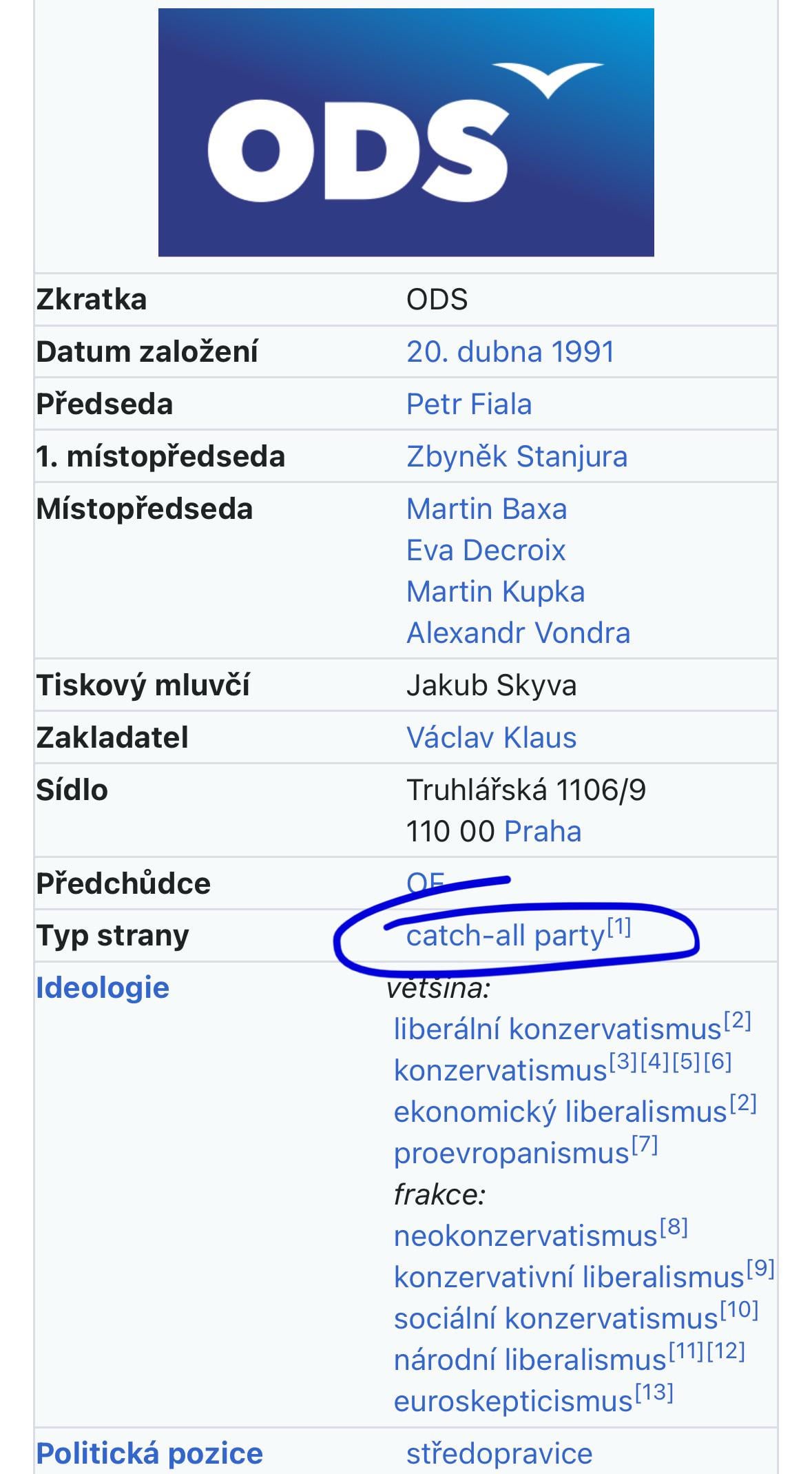 V době, kdy se každý dívá spíš na to, co jsi udělal blbě, než co jsi udělal dobře, je ODS doslova “catch-all-co-mají-velký-problém-se-všemi-ostatními-stranami-ale-chtejí-jít-k-volbám”. Takže asi záleží jak volnou definici jsi ochotný přijmout.