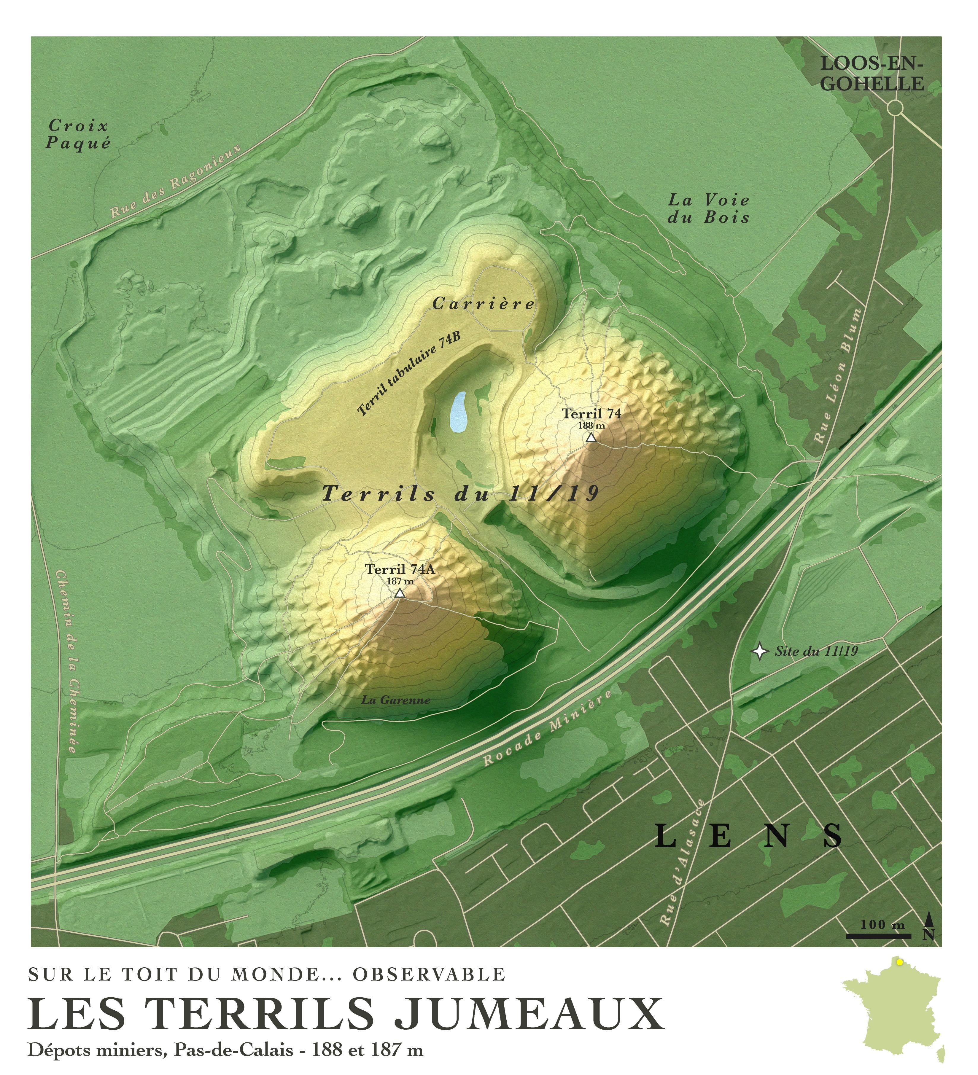 Ces sommets sont tout jeunes : Ils ont à peine un siècle et doivent leur existence non pas à la collision de plaques tectoniques entre elles, mais à notre appétit énergétique. Ce sont les terrils jumeaux, les deuxième plus hauts du Monde !