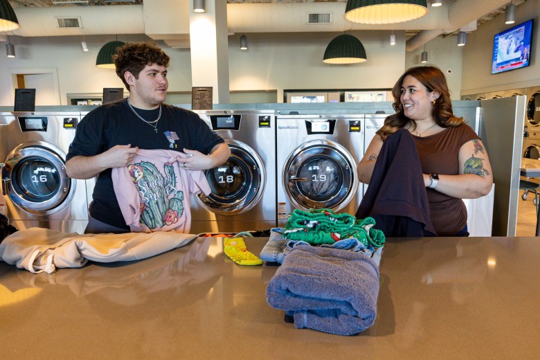 UTSA students Tre Marcus Kleczkowski and Bella Gomez knock out a couple of loads of laundry during their school week at SOAP on Dec. 10, 2025. Credit: Amber Esparza / San Antonio Report