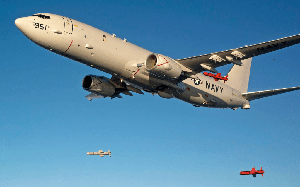 A U.S. Navy P-8A launching a trio of AGM-84 Harpoon anti-ship missiles during a test. U.S. Navy A P-8A launching a trio of AGM-84 Harpoon anti-ship missiles during a test. U.S. Navy