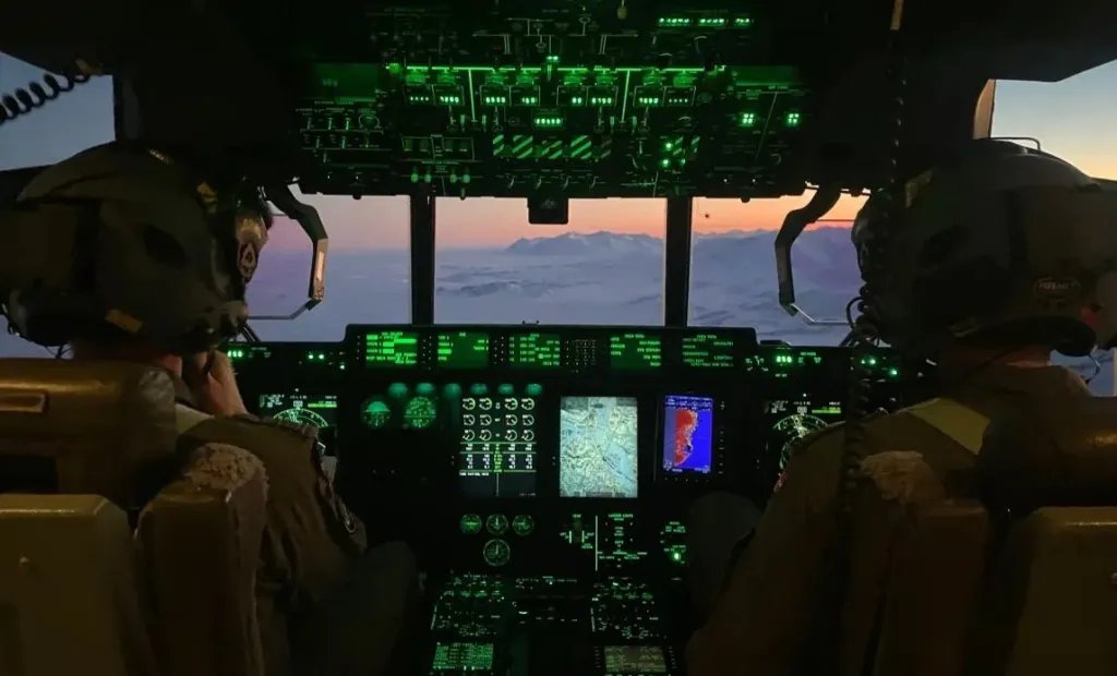 The view from the flight deck of a Royal Danish Air Force C-130J transport during a mission over Greenland. RDAF