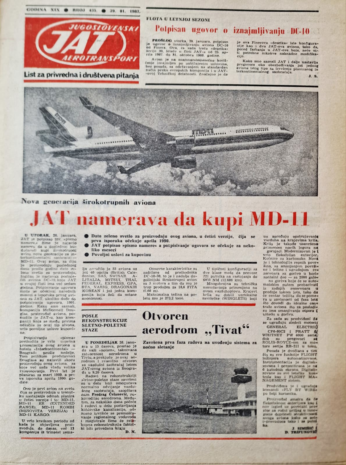 The year 1987 marked an important milestone for JAT. During this period, the airline introduced automated ticketing at its Belgrade head office, launched a second cargo-only service to Paris to complement its existing London operation, and banned smoking on domestic flights. It also expanded its new business class product, Adriatic Class, onto domestic services. Beyond its core passenger operations, JAT signed an agreement with Paris-based SNECMA (today known as Safran), one of the world’s leading civil aircraft engine manufacturers, for the joint construction of a jet-engine test stand in Belgrade. The airline also expanded its non-aviation and support infrastructure, opening the Sunny Peaks hotel complex on Kopaonik Mountain and a new 8.000-square-metre catering facility in Belgrade. At the same time, in 1987, JAT continued its fleet modernisation, taking delivery of new Boeing 737s, a DC-10 and ATR42 aircraft, while also placing an order for the acquisition of three ATR72s and a letter of intent for the purchase of new MD-11 jets, for which it would become the launch customer. During the year, JAT introduced new routes including Los Angeles and Calcutta, as well as wide-body operations between Ljubljana and London Heathrow.