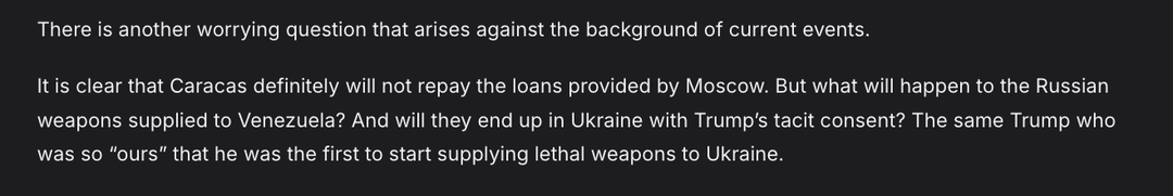 Russian milbloggers now fret that Moscow’s weapons stockpiles in Venezuela might not only vanish with unpaid loans but suddenly “reappear” in Ukrainian hands. 03.01.2026