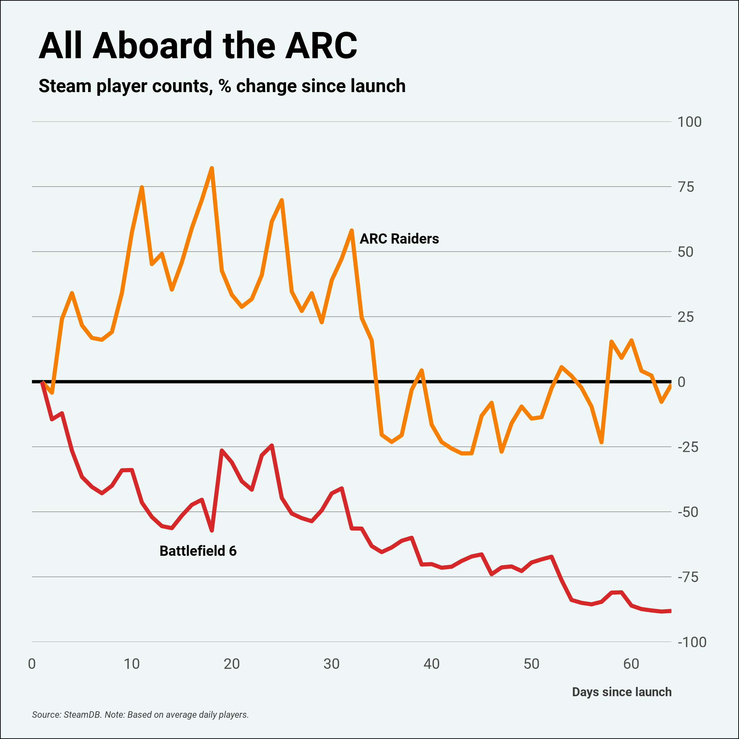 This is a strange graph. What does the Zero mark represent? I assume noone is suggesting BF6 is at NEGATIVE 75% players, and that Arc Raiders is at 0?