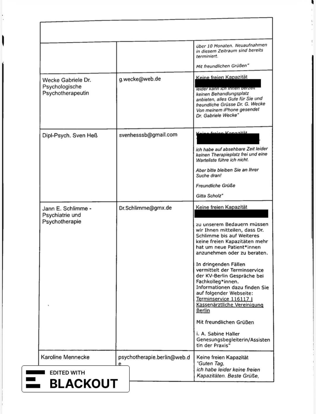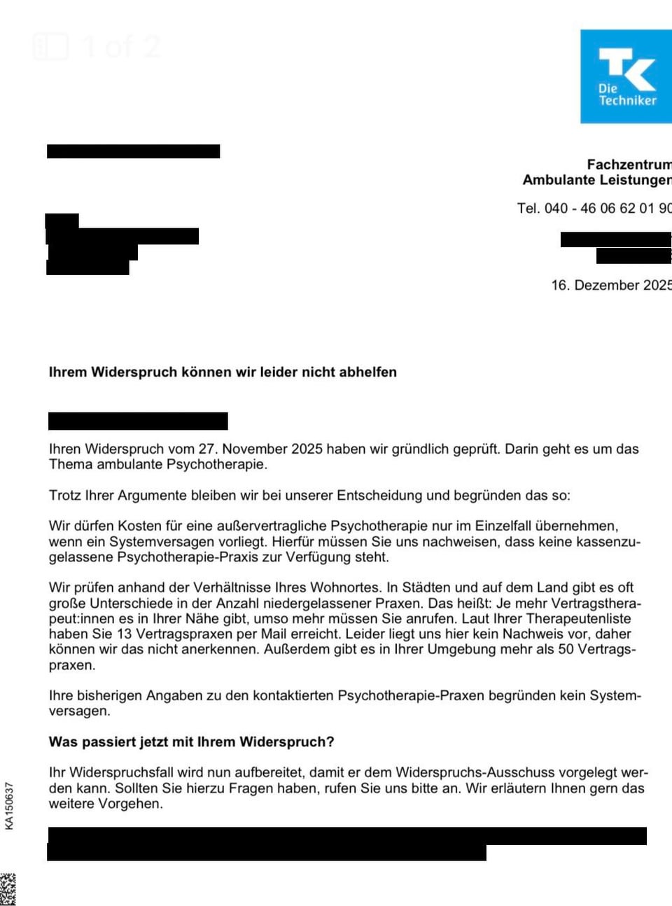 Within 2 months, I documented 24 rejections/request attempts, 2 sprechstunde visits via 116 117, and 2 prescriptions for needed psychiatric care from my hausartzt and from an emergency psychiatrist. I submitted this documentation with my PTV 11 and an explanation of my case (need for therapy, no space in the practices covered by TK within 3km of me). They rejected it with the reason that there are over 50 practices under TK in my district, and that my search attempt of the last 6 months didn’t prove a system failure.