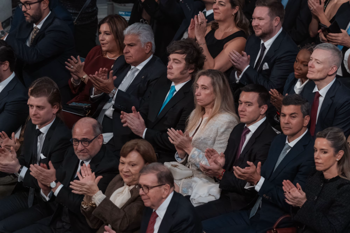 The legitimate winner of the Venezuelan presidency in 2024, Edmundo Gonzalez Urrutia (bottom left center), his wife and four other South American presidents were in the audience at the Nobel Peace Prize ceremony in Oslo last month. The president of Argentina (blue tie) was among those hailing the US intervention this weekend, while Brazil’s president, Luiz Inacio Lula da Silva, was among the critics. EU officials were awaiting a meeting with US Foreign Minister Marco Rubio. PHOTO: ©Nobel Prize Outreach-Helene Mariussen