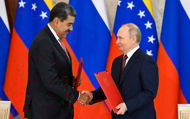 Russian President Vladimir Putin, right, and Venezuelan leader Nicolas Maduro shake hands as they exchange documents during a signing ceremony following their talks at the Kremlin in Moscow on May 7, 2025. (Alexander NEMENOV / AFP)