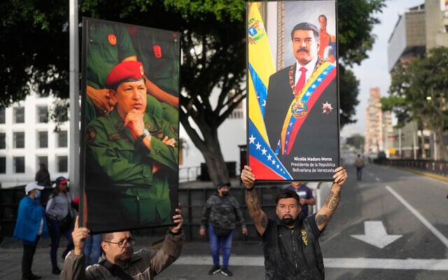 Government supporters display posters of Venezuelan President Nicolás Maduro, right, and former President Hugo Chávez in downtown Caracas, Venezuela, January 3, 2026, after US President Donald Trump announced that Maduro had been captured and flown out of the country. (AP Photo/Matias Delacroix)