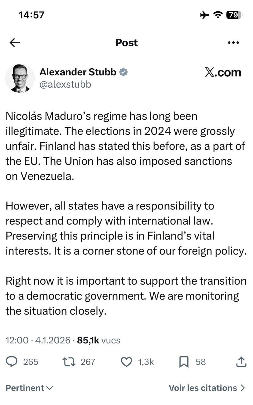 Like I said before. It is all about the oil but this is how Finland should react given it’s security situation. We condemn warmongering in all fronts but this is how we as a small Eastern European and a fresh NATO member need to react. Alex played his part in favor of our country as he should. I hate that world is in this state of waging war and all of it is unnecessary. I hope as they rob the oil from Venezuelan soil they also make sure there is a democratic election that follows. It is another shit show but in a sense it was effective. They acquired their target in matter of days. Unlike the “special military operation” that is for the ridicule of Russia and is a symbol of Ukrainian bravery. This is the difference when you have a professionally acting army instead of orcs with guns.