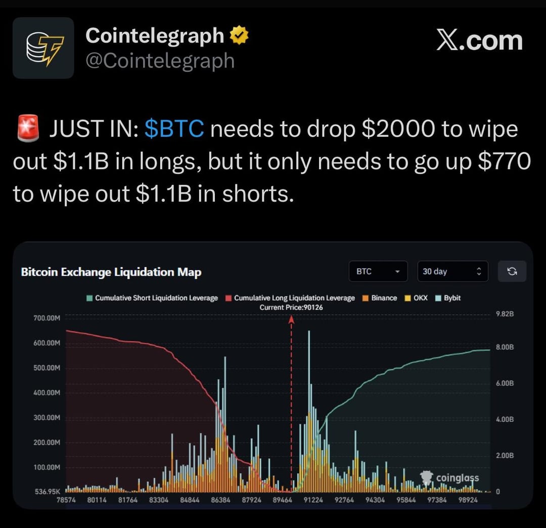 Old news. Price at time of posting was $90,127. It passed $90,897 a while ago. So that means it’s some to drop to $88,127 and wipe out the longs probably lol