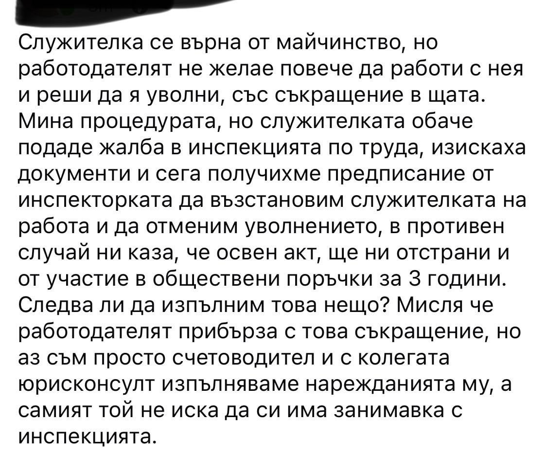 Аз бих го съдил , ей така, за спорта. Сигурен съм, че ще има за какво, щом като и Инспекцията по труда предписват връщане на служителката.