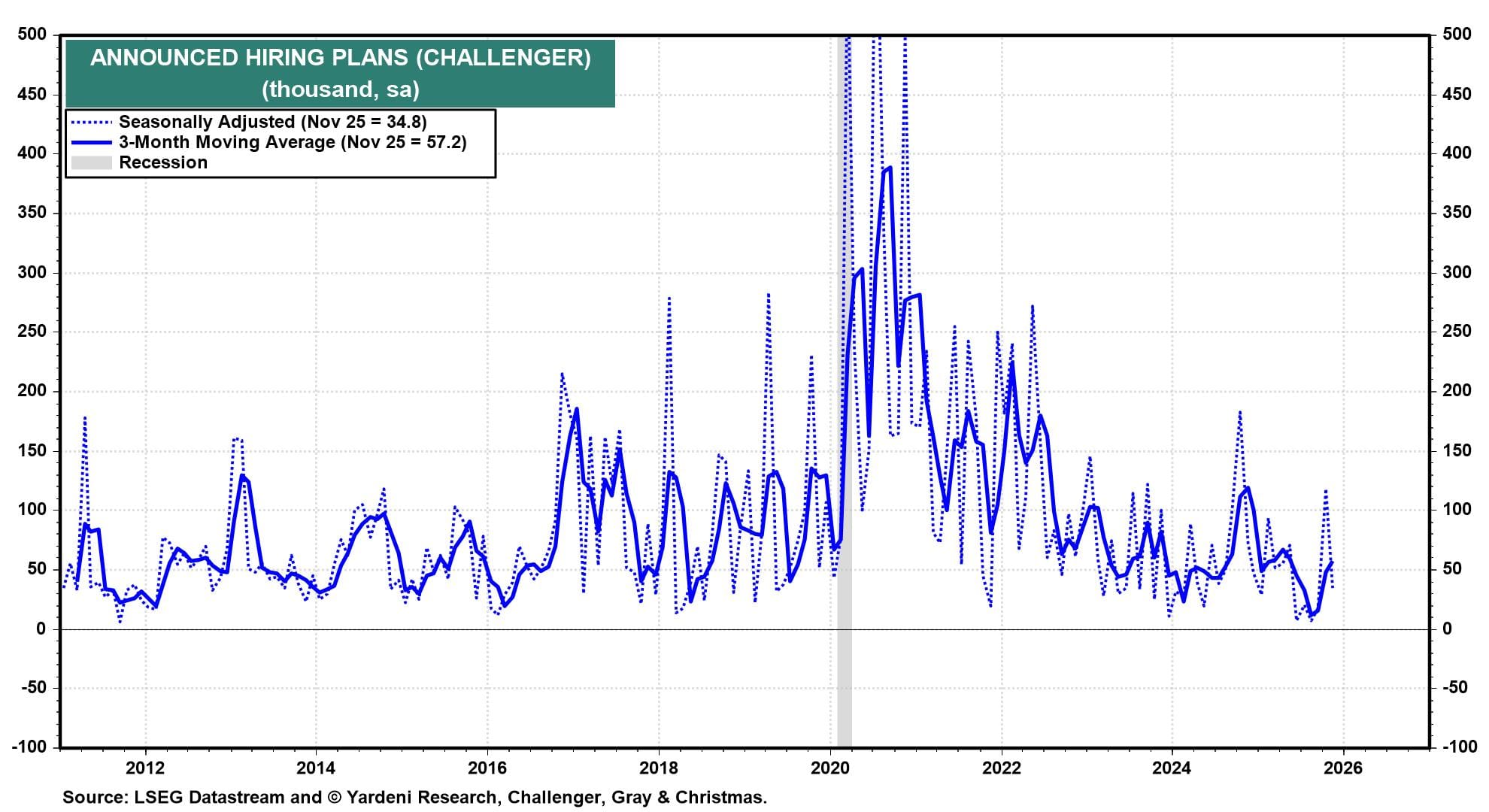 (3) JOLTS series. Given the market’s extreme focus on the health of labor markets, November JOLTS figures (Wed) on job openings, hires, quits, and layoffs could provide timely clues. In October, job openings remained stable at around 7.7 million, while hires and total separations were little changed. A day later, we’ll get the Challenger, Gray & Christmas layoffs report (Thu) for December. November showed a sharp 53% drop in planned layoffs (chart).