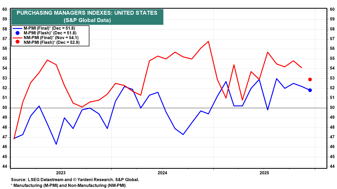 (2) PMI data. The week kicks off with the Institute for Supply Management’s manufacturing purchasing managers’ index for December (Mon). November’s reading was 48.2. The report may receive greater attention following last week’s somewhat mixed S&P Global US Manufacturing PMI (chart). Though output growth remains solid, new orders declined for the first time in a year, taking input costs down with them. ISM’s non-manufacturing PMI (Wed) could be weaker than November’s reading, based on the S&P Global flash report for services.