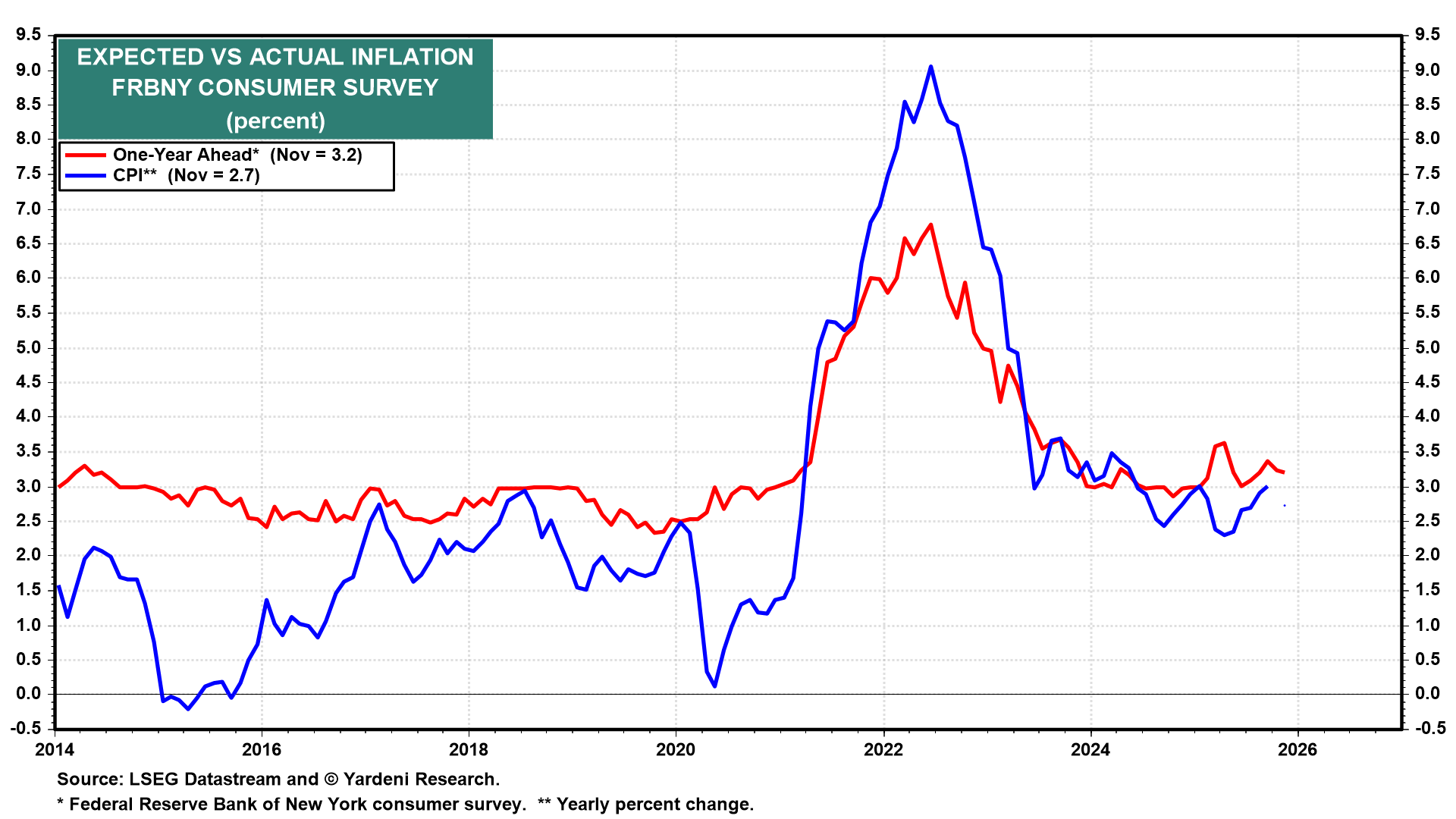 (4) Inflation expectations. Given doubts about the quality of recent government price data, post-shutdown, the New York Fed’s December inflation expectations survey (Thu) could fill in some blanks. In November, expectations were steady at 3.2% (chart). Meanwhile, perceptions about job prospects improved markedly. It all makes you wonder why exactly the Fed thought it was a good idea to cut rates again last month.