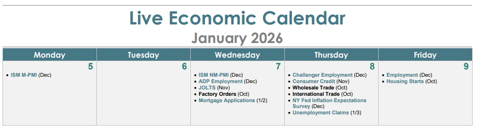 With the holidays behind us, the first full trading week of the year is a busy one on the data front. The big focus, naturally, is on the December employment report. It’s the first “full” release since the government shutdown caused data interruptions. It also marks a return to normalcy for investors eager to gauge how the Fed might proceed in the weeks ahead.