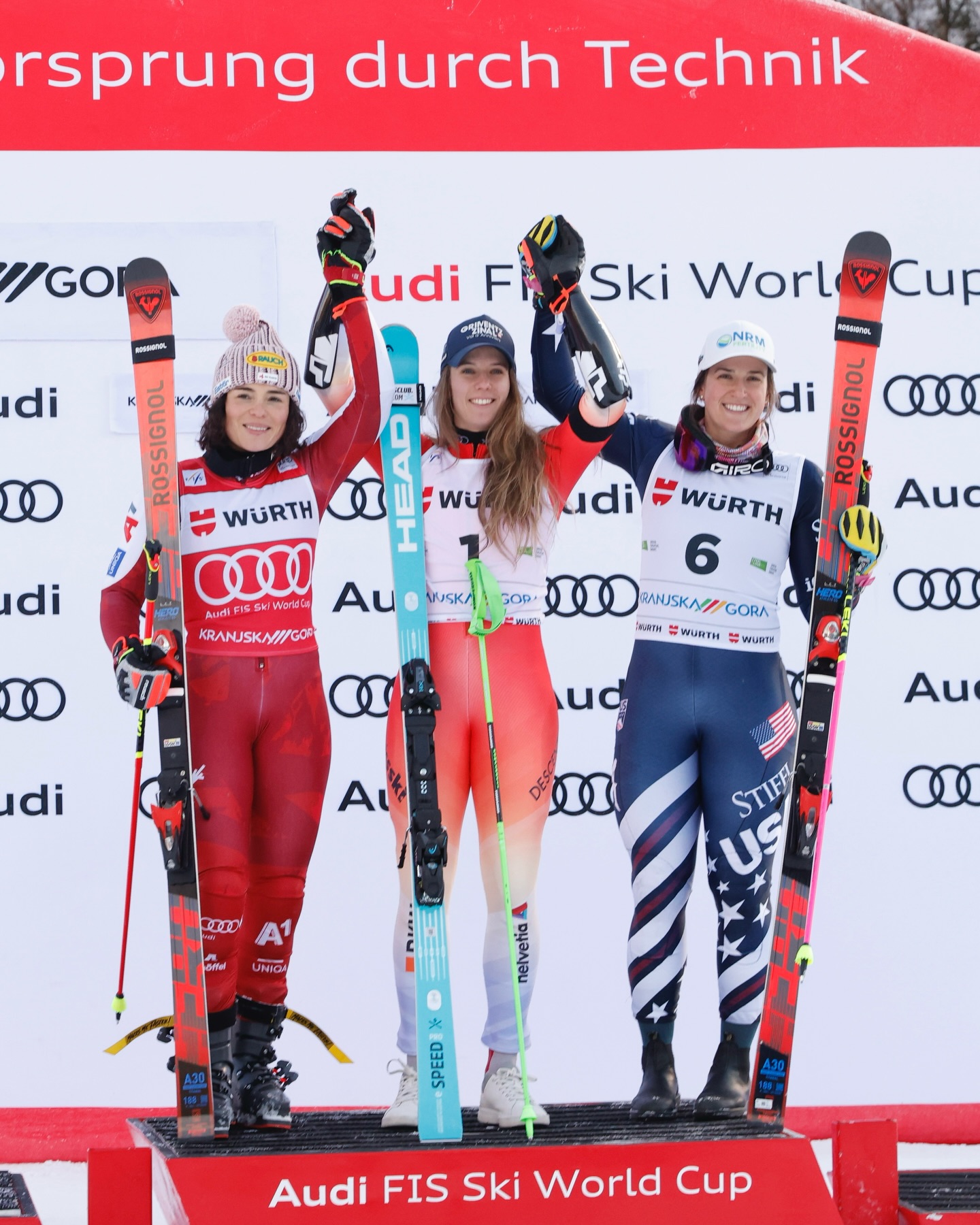 The Giant Slalom podium in Kranjska Gora: Camille Rast 1st, Julia Scheib 2nd, Paula Moltzan 3rd. | Image: FIS Alpine